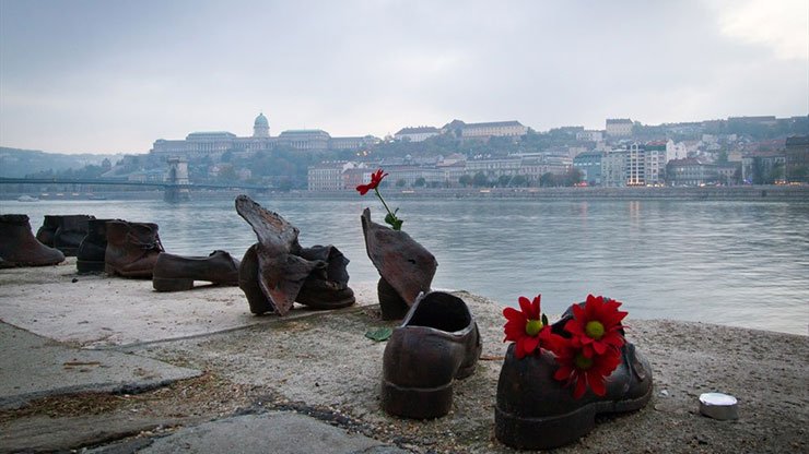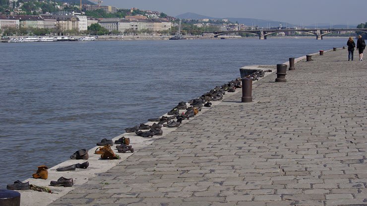 На набережній Дунаю стоять бронзові черевики різної форми та розміру: жіночі, чоловічі, дитячі. Нові на вигляд та стоптані, старі старомодні. Спочатку пам’ятник складався з 60 пар взуття, зараз їх поменшало.
