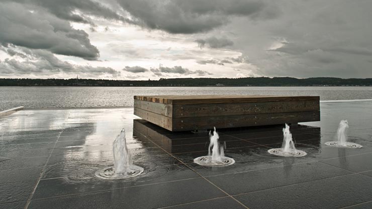 Фонтан біля води створений, як частина величезного парку у місті Квебек. Автори зробили надсучасний дизайн, поєднавши дерево, камінь, граніт та інші матеріали у мінімалістичні рішення.