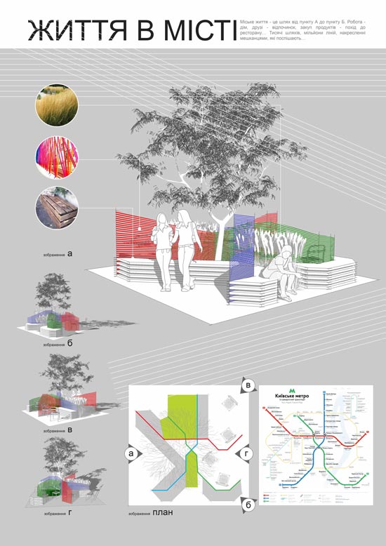 Студія VPoleDesign розробила проект саду, функціональне зонування якого сформовано за схемою Київського метрополітену. Каркас, у вигляді різнокольорових ліній, дозволяє організувати внутрішній простір і передати самобутність дизайну. Висота різнокольорових «ліній метро» відповідає глибині залягання станцій київського метрополітену.