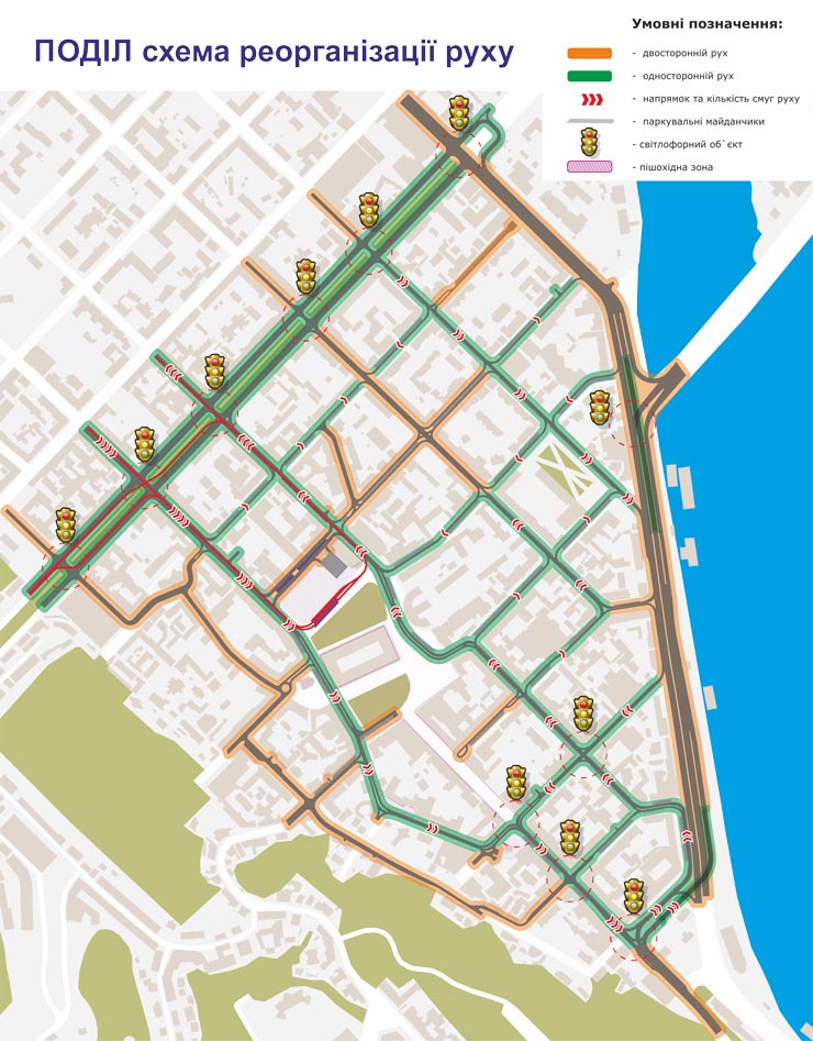 Для забезпечення комфортного функціонування пішохідного простору на Контрактовій, у 2018 році хочуть ввести односторонній рух у більшості кварталів від вулиць Нижній та Верхній вал до Поштової площі.