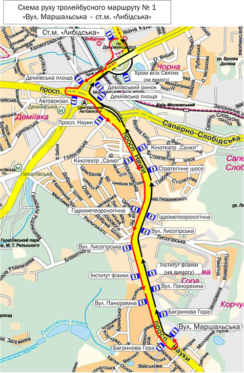Як повідомляє прес-служба КМДА, відтепер тролейбуси №1 курсуватимуть за маршрутом: Просп. Науки – ст. м. «Либідська» буде організовано так: просп. Науки – б-р Дружби народів – вул. Велика Васильківська  – Либідська площа – вул. Антоновича – б-р Дружби народів – просп. Валерія Лобановського – просп. Науки.