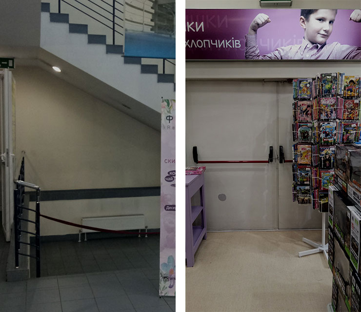Кілька дверей з позначкою «Вихід» розташовані безпосередньо в магазинах. І ставлення до них, відповідно, різниться: в одному консультанти, здається, взагалі не знали про шлях евакуації. У іншому – дверні ручки перев’язали дротом; ще в одному двері були закриті, проте ключ висів поруч в опломбованій скрині. В усіх трьох вихід був перегороджений конструкціями (варто зазначити, що вони були пересувними, на коліщатах), і стосовно них нам відповідали однаково: «Це ми тільки ось перевішували товар, ще не встигли забрати».