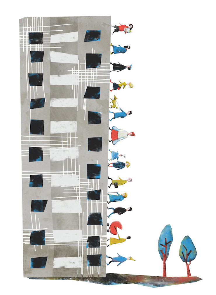 Вже декілька місяців, як у будинку нарешті з’явився ліфт. Але запустити його ми все одно не можемо — чинний генератор його не потягне. Тому кожен мешканець нашої 25-поверхівки має покладатися лише на власні ноги. Так, у нас живе молода мати з двома маленькими дітьми. Щодня вона тягає ці коляски по сходах — на свій сімнадцятий поверх. Але вона доволі швидко з цим змирилася. Каже: «Я не можу собі дозволити орендувати квартиру, хай навіть більш зручну, і витрачати більше восьми тисяч гривень на місяць». Відома приказка «Маленька, зате своя» спрацьовує у нас бездоганно.