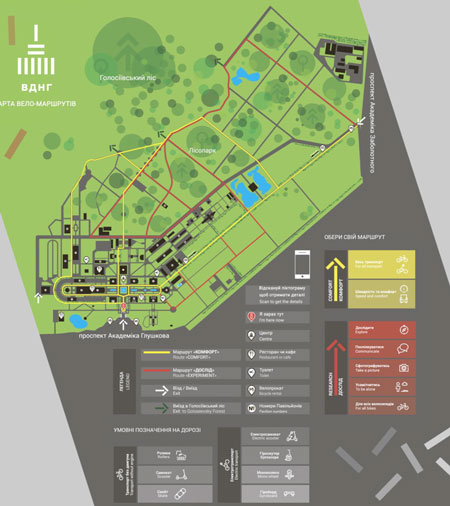 «Ми розробили навігацію для поділу потоків відвідувачів – велосипедисти – окремо, пішоходи – окремо. Тому що на вихідних на центральній площі багатолюдно. Та й велосипедистам, які вперше потрапляють в парк, так буде значно зручніше. Звичайно ж велодоріжки будуть не тільки в центрі. Проект розбитий на три етапи. Перший: нанесення дорожньої розмітки та піктограм на центральній частині. На другому етапі – ми продовжуємо їх на асфальтних доріжках, що примикають до центру. І третій етап: встановлюємо знаки навігації і інфостенди в лісопарковій частині. Перший – ми вже реалізували, другий – запланували на 2019 рік, та й третій також зможемо реалізувати в наступному році якщо знайдемо спонсора», – розповідає арт-директор ВДНГ Марина Матросова.