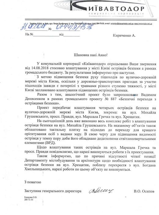 «Також інформуємо, що по причині відсутності чіткої позиції Департаменту містобудування та архітектури щодо влаштування острівців безпеки на вулиці Хрещатик, поблизу вулиці Богдана Хмельницького, наразі роботи по цьому об’єкту не виконуються», — наголошують у підприємстві.