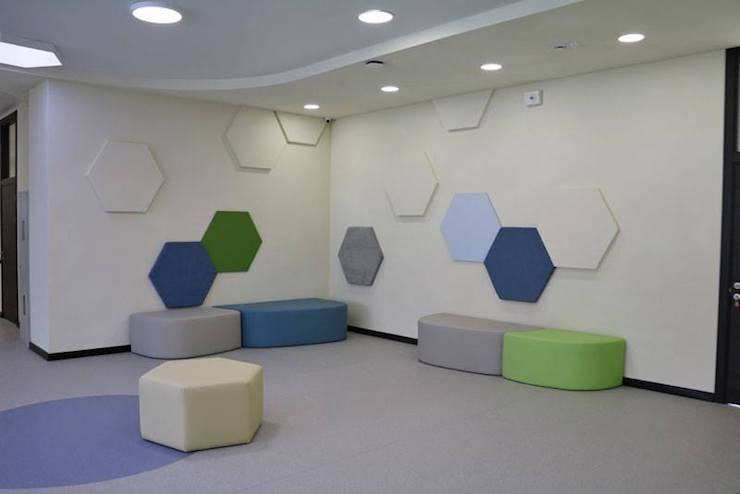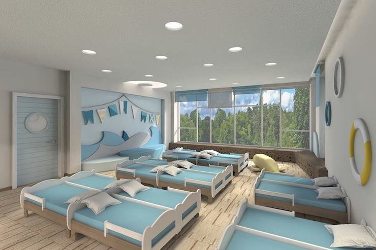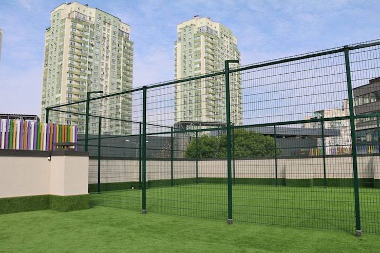 На даху школи розміщено спортивний майданчик. Для денного сну першокласників обладнали спальну кімнату.