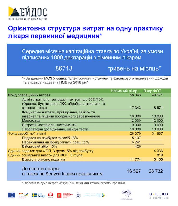 Експерти Центру політичних студій та аналітики «Ейдос» склали таблицю, яка демонструє формування заробітної плати сімейного лікаря після медичної реформи.