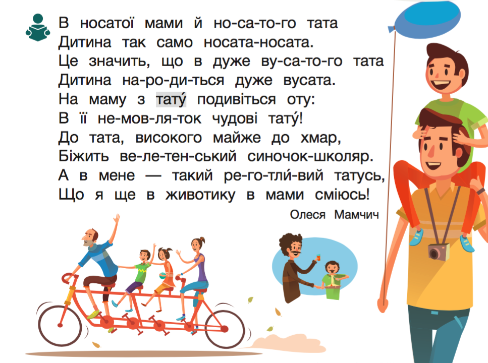 В одному з віршів героїня, мама, має татуювання. В маленькому оповіданні тато ліпить з дітьми вареники, а мама – вішає картину на стіну. Ще в одному вірші розповідають про традиційну страву кримських татар, яку куштують греки. Окрім притаманних таким підручникам тварин та рослин автори згадують також роботів, селфі, подорожі до інших країн, приміщення театру та музею тощо.