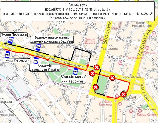 14 жовтня, з третьої години дня у центрі міста зміниться схема руху транспорту, повідомляє КП «Київпастранс».