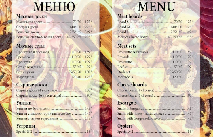 Крім прошуто у меню є інший різновид італійської шинки – брезаола, а також устриці, виноградні равлики, ковбаса мортаделла та сири.