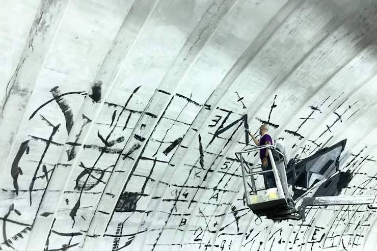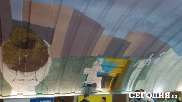 На станції метро «Осокорки» триває робота з розпису склепіння платформи під кураторством Гео Лероса. Минулої ночі художники зобразили чорно-білий пейзаж із рожевим дитячим малюнком поверх нього.