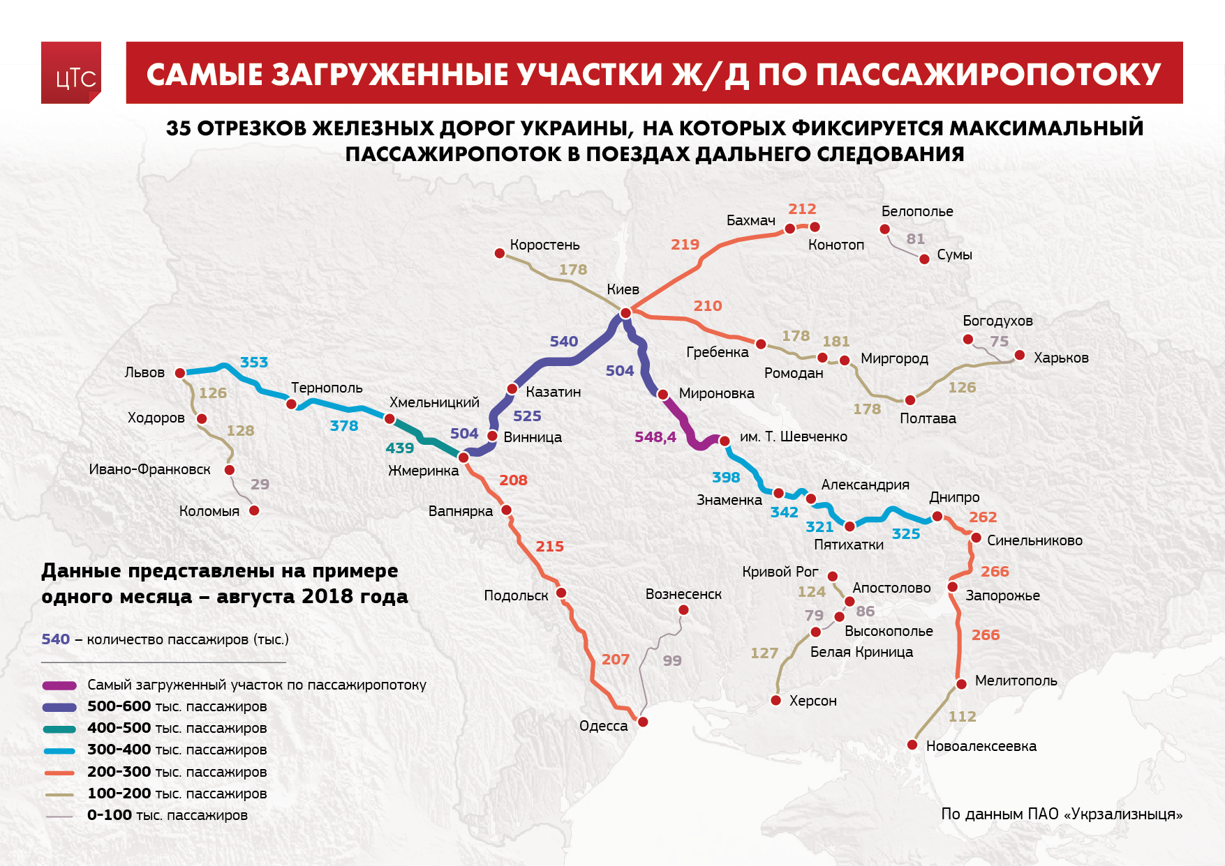 Ці дані «Укразалізниця» надала за серпень 2018 року. Згідно з ними, велика кількість пасажирів переміщається у напрямах Київ-Львів та Київ-Дніпро. Ще одним популярним напрямом влітку стала Одеса і Херсон.