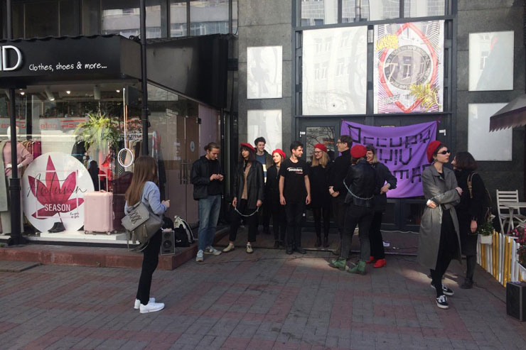 «Цей художній протест — наша спонтанна реакція, — розповідає “Хмарочосу” учасниця акції Анастасія Теор. — Люди в кашкетах і з ланцюгами відтворюють кадр зі стрічки «Мрійники» режисера Бернардо Бертолуччі. У ньому головна героїня прив’язує себе ланцюгом до кінотеатру, протестуючи проти закриття “Сінематики” в Парижі. Так ми хочемо привернути увагу киян до того, що відбувається з нашим містом: люди з великими грошима роблять з ним, що їм заманеться, повністю ігноруючи інших його мешканців».