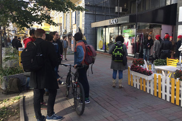 Перехожих у цей час на Шота Руставелі не так і багато: о дванадцятій годині на Хрещатику вже почалося святкування Дня захисника України. Але ті, хто зупиняється дізнатися, що відбувається, активістів підтримують.
