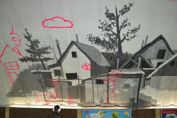 Нагадаємо, що коли на стінах з’явилася частина муралу, яка зображає чорно-білі будинки та рожевий дитячий малюнок, пасажири метро поскаржилися в поліцію на вандалізм. Гео Лерос пояснив, що це насправді задум художника.