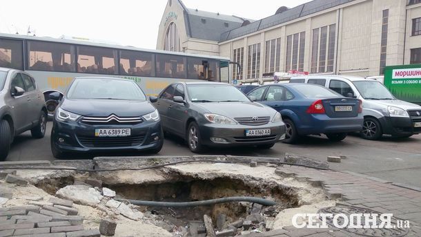 На тротуарі біля входу до Центрального залізничного вокзалу Києва утворилась яма.