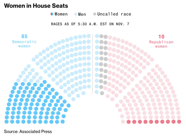 На проміжних виборах у Конгрес США жінки отримали рекордну кількість місць в палаті представників, пише Bloomberg.
