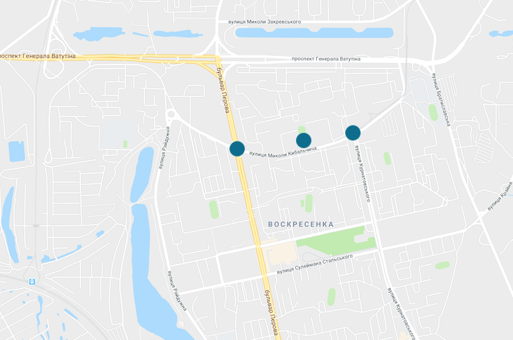 Один світлофор поламали на перетині бульвару Перова і вулиці Миколи Кибальчича, два пішохідні світлофори – на зупинці «Школа», і ще два – на перетині Кибальчича і вулиці Курнатовського.
