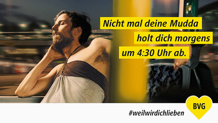BVG стала відома своєю креативною рекламою та SMM після запуску в 2015 році медійної кампанії зі слоганом «Weil wir dich lieben» – «Бо ми тебе любимо». Це зробили після того, як низка досліджень виявила прохолодне ставлення берлінців до комунальної компанії.