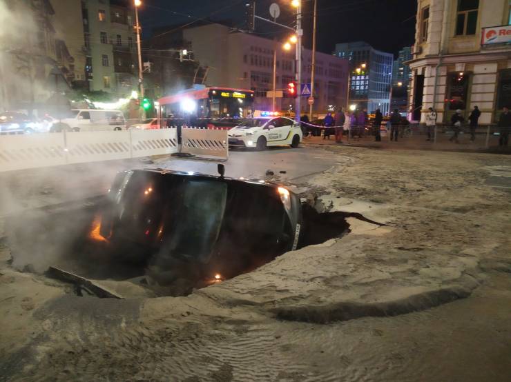 На перетині вулиці Саксаганського та Шота Руставелі аварійні бригади перекрили воду, тому на вулиці пари вже немає. Проте стало видно, що аварія спричинила провал асфальту, через який в ямі опинилась автівка.