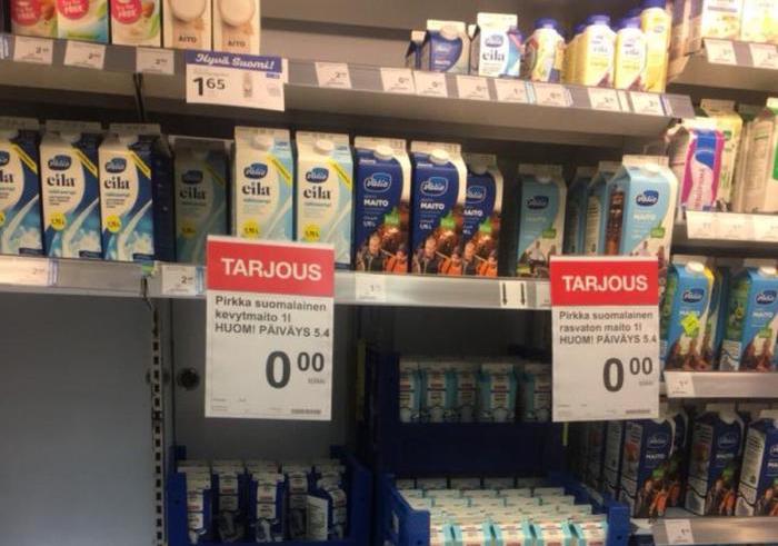 Безкоштовне молоко, термін придатності якого спливає, в одному з супермаркетів у Фінляндії. Фото: Vasyl Mykolenko/Facebook