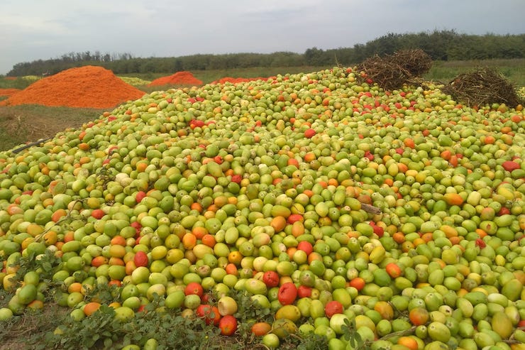 Викинуті томати біля міста Гола Пристань Херсонської області. Фото: Yevhen Buderatsky/Facebook