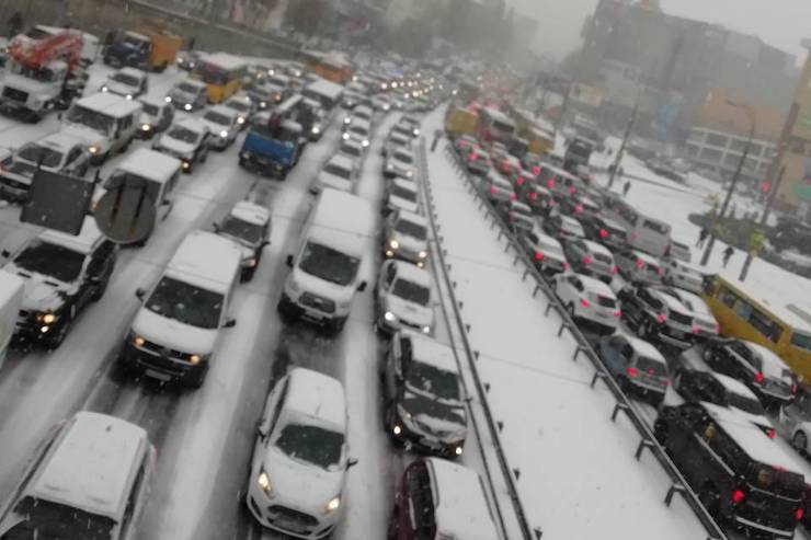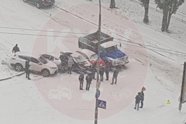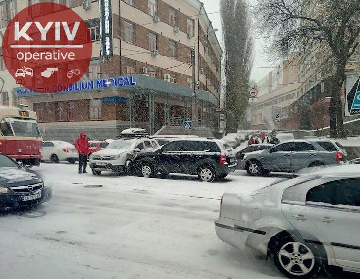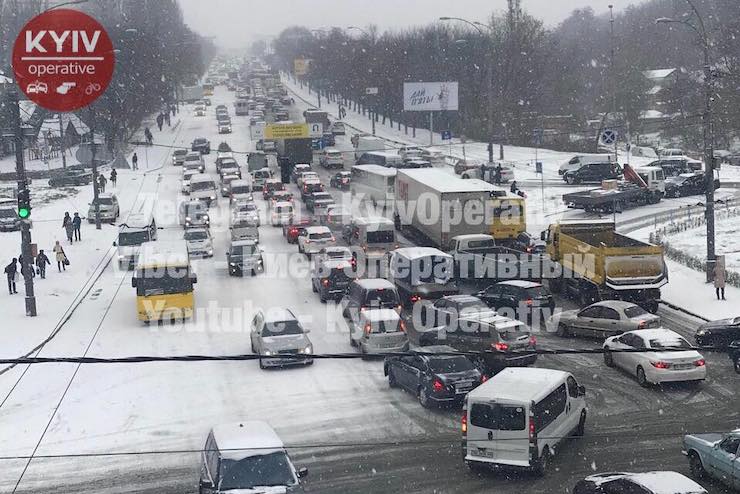 Київ з ранку й досі стоїть у сильних заторах через снігопад та численні аварії. Незважаючи на попередження, велика кількість водіїв виїхала в місто на літніх покришках. Через це деякі авто не змогли подолати підйоми на вулицях із нахилом. Водії втрачають керування на слизьких дорогах.