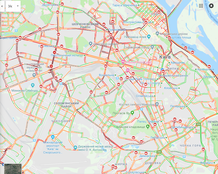 dtp.kiev.ua повідомляє про понад 220 аварій по всьому місту, зокрема п’ять з постраждалими. Патрульна поліція України повідомляє про 294 звернення про ДТП у Києві станом на 13:00.