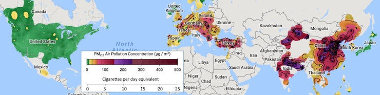 Концентрація шкідливих речовин у повітрі у світі. Коричневі зони вказують на еквівалент 25 сигарет на день. Інфографіка: berkeleyearth.org