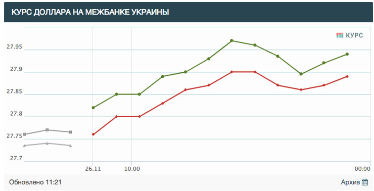 У київських обмінниках курс продажу підняли одразу на 30 копійок – з суботніх 27,90 до 28,20 гривень в понеділок.