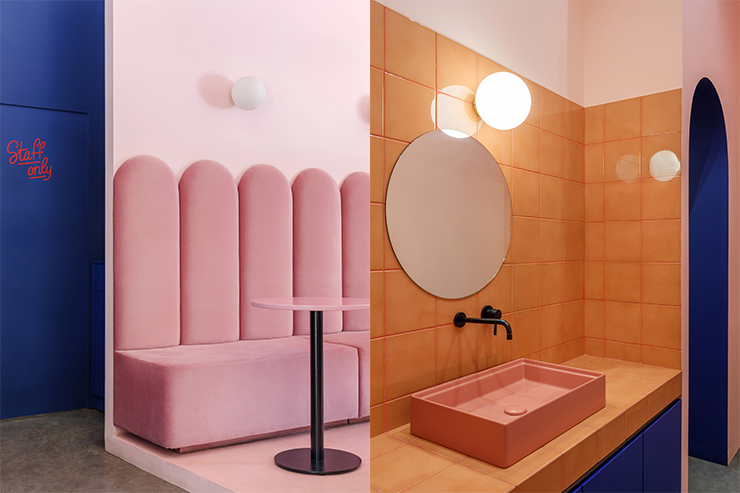 В оформленні інтер’єру використали пастельний рожевий, насичений синій та світло-сірий кольори, сіру керамічну плитку з рожевою затиркою і бетонну підлогу. Меблі було зроблено спеціально для кафе Breadway.
