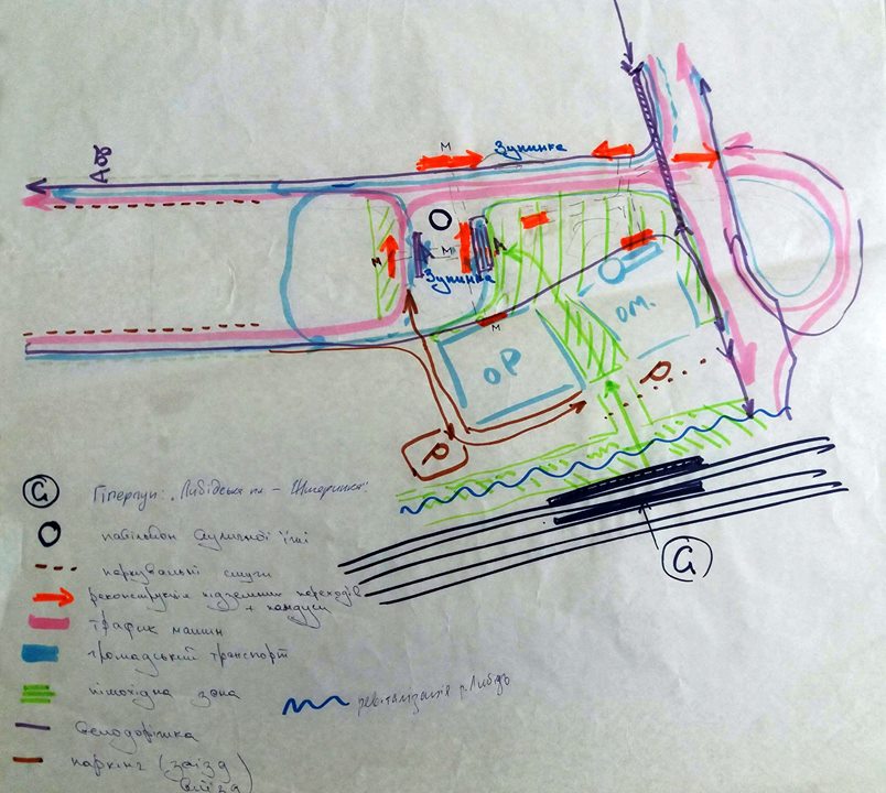 «Рух автомобільного транспорту з вулиці Антоновича пропонують запустити чинним проїздом, що ближче до центру; громадського – в той проїзд, що і зараз (де розвертаються автобуси, що їдуть з проспекту Науки або з Дружби Народів). Тут можна виділити декілька смуг руху і посадочних платформ. Далі загальний потік транспорту спрямовується через існуючу автостоянку, що цілком піддається переплануванню і реконструкції», – сказано у висновках воркшопу.