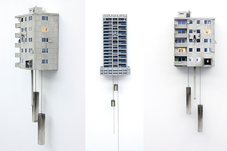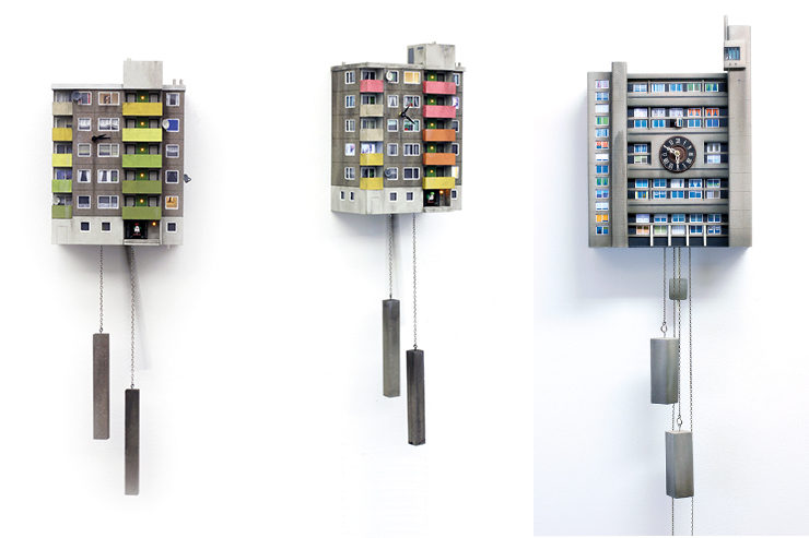 Художник із Франкфурта Гвідо Циммерман створив настінні годинники з маятником у формі бруталістських будинків, повідомляє ArchDaily.