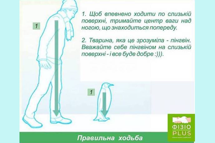 Прес-служба Дарницької районної адміністрації опублікувала в Facebook інфографіку про безпечний спосіб ходіння слизькою поверхнею. Аби убезпечитися від падіння, слід тримати центр ваги тіла над ногою, що попереду.
