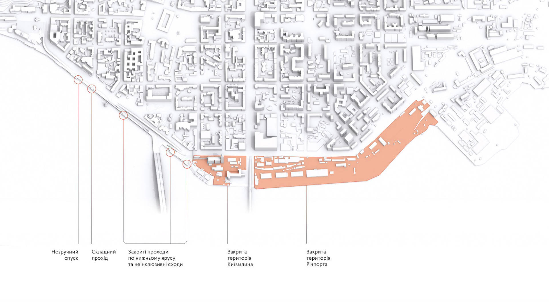 На думку команди, нині набережна відрізана від основного Подолу Набережно-Хрещатицьким шосе. «Щоб дістатись набережної, доводиться спускатись в неосвітлені та незручні підземні пішохідні переходи», – пише команда.