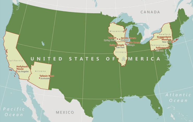 Френк Ллойд Райт був прибічником «органічної» архітектури, яка продовжує навколишній ландшафт та зливається з природою. До переліку об’єктів, що презентують його архітектурну спадщину, увійшли: