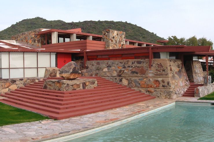 7) Західний Талієсін, Скоттсдейл, штат Аризона, 1938 рік. Це була зимова резиденція Райта, в якій він жив до своєї смерті у віці 91 року. Стіни будинку, розташованого посеред аризонської пустелі, архітектор збудував із місцевого каміння, з’єднаного бетоном.