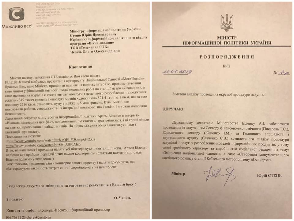 Міністр інформаційної політики Юрій Стець повідомив, що дав розпорядження про проведення внутрішнього аудиту стосовно проекту розпису станції метро «Осокорки». Нагадаємо, журналістка телеканалу СТБ повідомила, що художники проекту працювали безкоштовно, хоча за бюджетом проекту мали отримати 1,7 мільйона гривень гонорару.