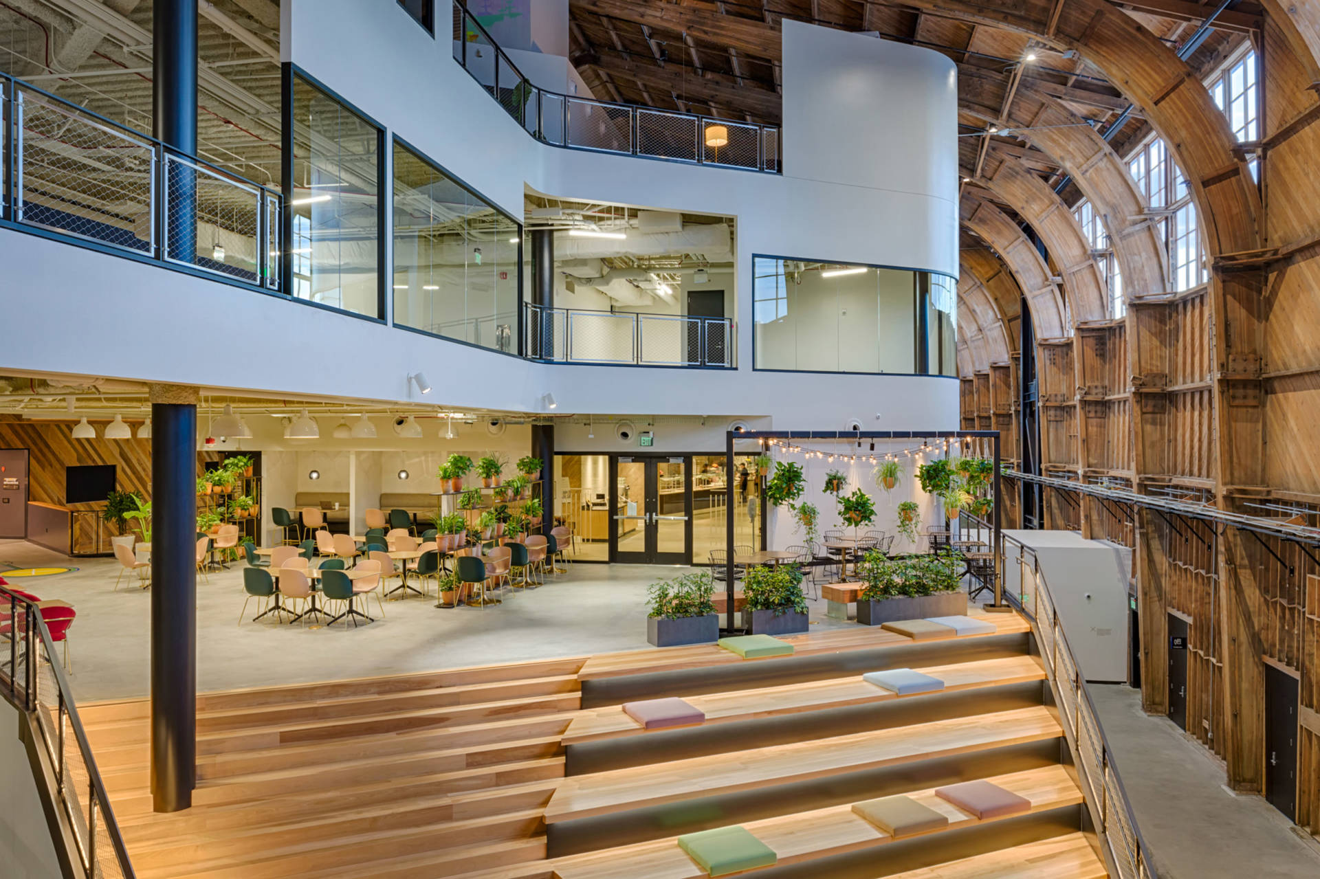 Американське бюро ZGF спроектувало для Google офіс у колишньому лос-анджелеському ангарі – це семиповерхова будівля віком 70 років. Нове приміщення компанії площею більш як 40 тисяч квадратних метрів налічує, зокрема, відкриті робочі місця, циркулюючі зони пересування та підлогову навігацію. Зазначають, що офіс справляє враження «будівлі, побудованої всередині будівлі».