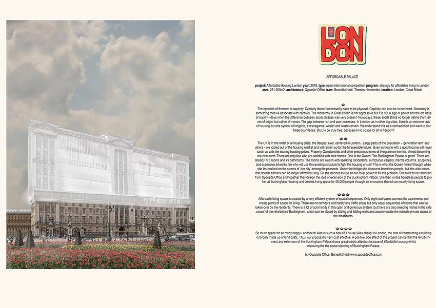 Мюнхенське архітектурне бюро Opposite Office презентувало концепцію «Доступний Палац», за якою королівські покої будуть добудовані та перетворені у спільне житло для 50 тисяч містян. У такий спосіб архітектори хочуть допомогти у вирішенні житлової кризи Лондона. Зазначимо, засновник бюро Бенедикт Хартл звернувся до Королеви з відкритим листом.