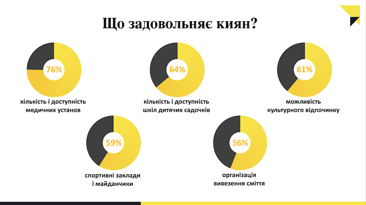 Можливості для занять спортом і організацію вивезення сміття кияни оцінюють як задовільні. Найменшу кількість негативних оцінок отримали доступність медичної допомоги та система громадського транспорту.