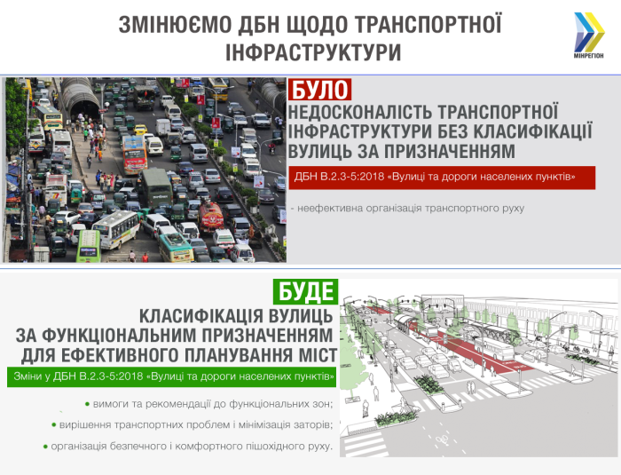 З вересня 2018 в Україні набули чинності нові ДБН щодо вулиць, які, зокрема, передбачають можливість звуження ширини смуг руху, обов’язкове встановлення захисних огороджень на зупинках, обов’язкове облаштування острівців безпеки на нерегульованих переходах, велодоріжок та велосмуг та інші зміни.