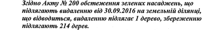 Водночас на сайті Київради можна ознайомитися з текстом рішення про передачу ділянки під забудову. У пояснювальній записці вказано, що видаленню підлягає одне дерево, а 214 дерев мають бути збережені. Отже, депутати Київради, приймаючи рішення про надання ділянки в оренду, не знали про те, що ці дерева будуть спиляні.