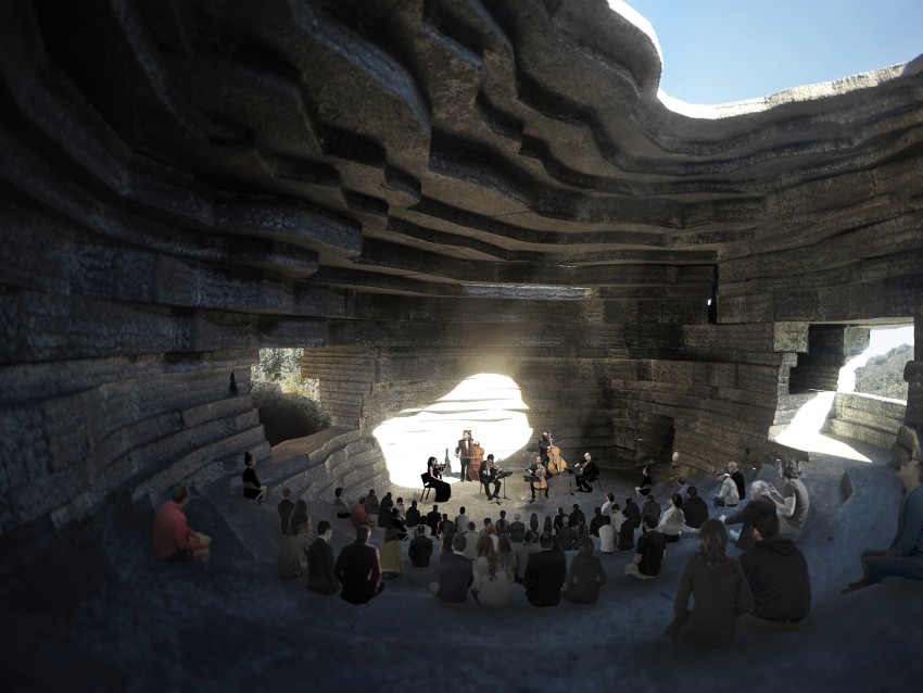У Ченде, Китай, недалеко від Великої китайської стіни бюро Open Architecture вирішило звести концертний зал. Його планують розташувати поміж схилами у лісистих горах.