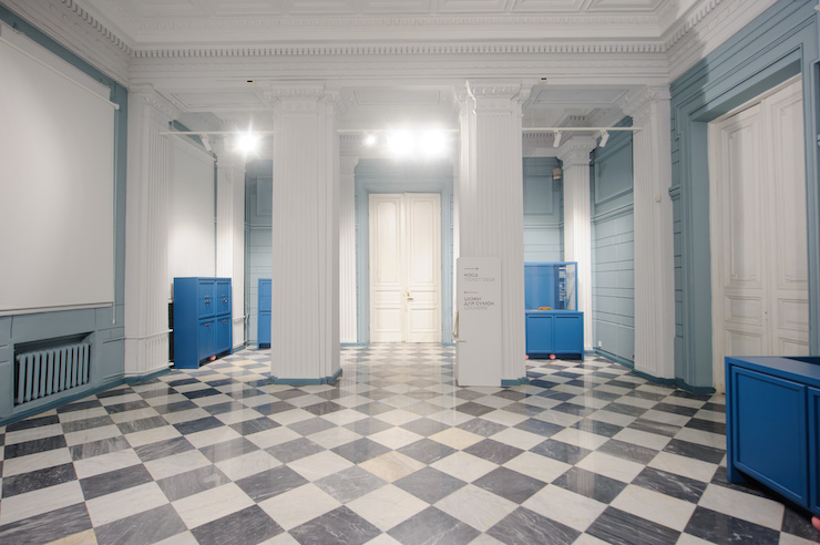 Головним акцентом інтер’єру стали білий периптер колон та пілястр. Аби підкреслити ці елементи, меблі зробили насиченого синього кольору.
