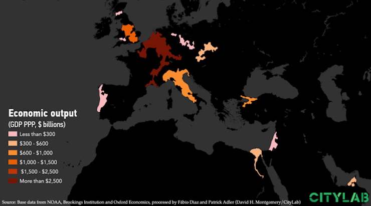 Загалом у Європі розташовано шість мегарегіонів: британський Лондон-Лідс-Честер (населення 22 млн, економіка 1,1 трлн доларів); Відень-Будапешт (населення 13 млн, економіка 555 млрд доларів); Ром-Мілан-Турин (населення 14 млн, економіка 513 млрд доларів); Барселона-Ліон (населення 7 млн, економіка 323 млрд доларів).