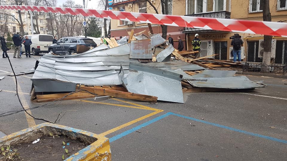 Сильний вітер у Києві зірвав шматок даху житлового будинку в центрі. Пошкоджено автомобілі (фото)