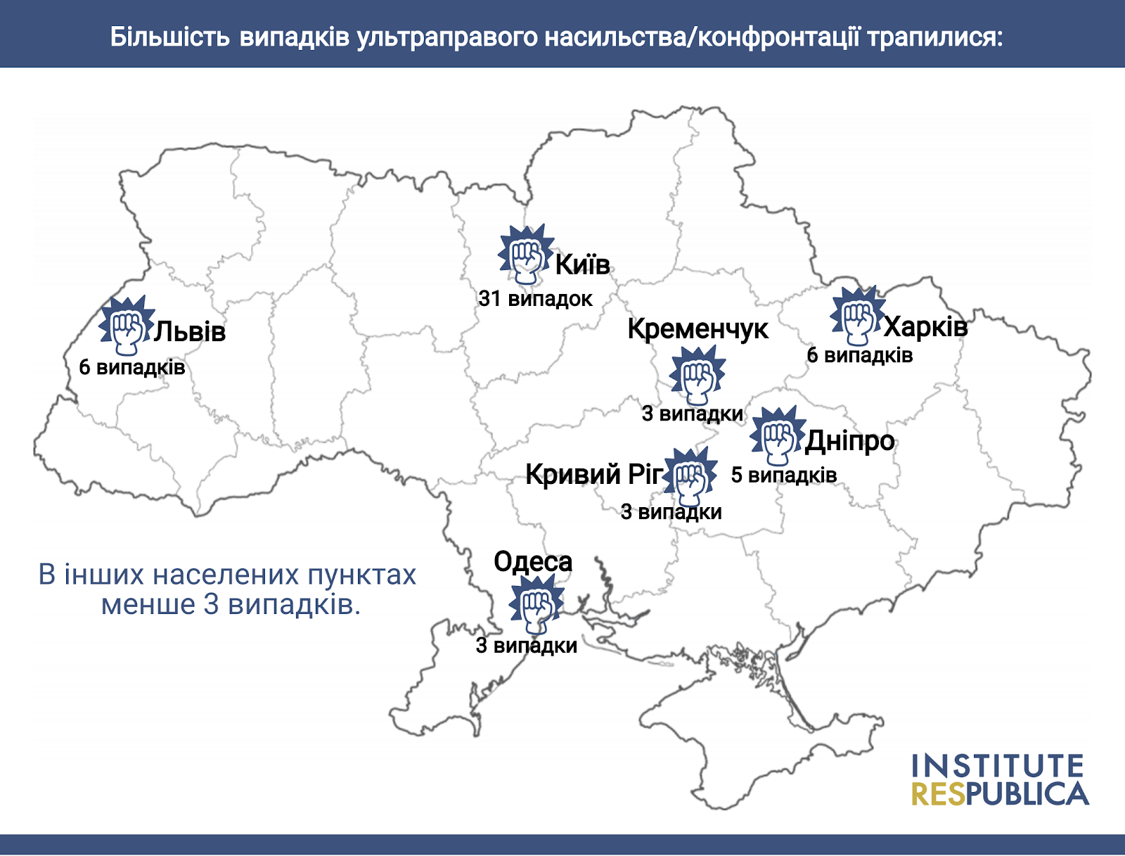 За п’ять місяців, з 15 жовтня 2018 року до 15 лютого 2019 року, Інститут «Республіка» зафіксував 71 випадок насильства з боку ультраправих. Шкоди зазнавали майно та люди, а в 16 випадках насильство було травматичним. Про це повідомляє «Політична критика».