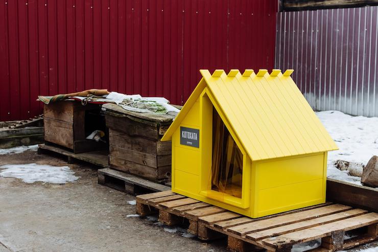 Одна хатинка може вміщати до 10 котів і витримувати температуру до -10°C. Її виготовлено з соснових колод, утеплено повстю та сіном і пофарбовано тонуючою атмосферостійкою деревозахисною олією.