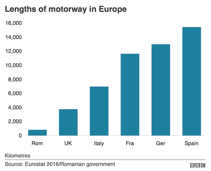 Наразі існує мережа автомагістралей Румунії загальною протяжністю 805 кілометрів. У 2017 році у країні з’явилося лише 15 кілометрів нових доріг. А в 2016-му на півдні Трансільванії побудували «шосе ганьби» – його довелося ремонтувати відразу після відкриття, а потім дорогу взагалі демонтували з міркувань безпеки.